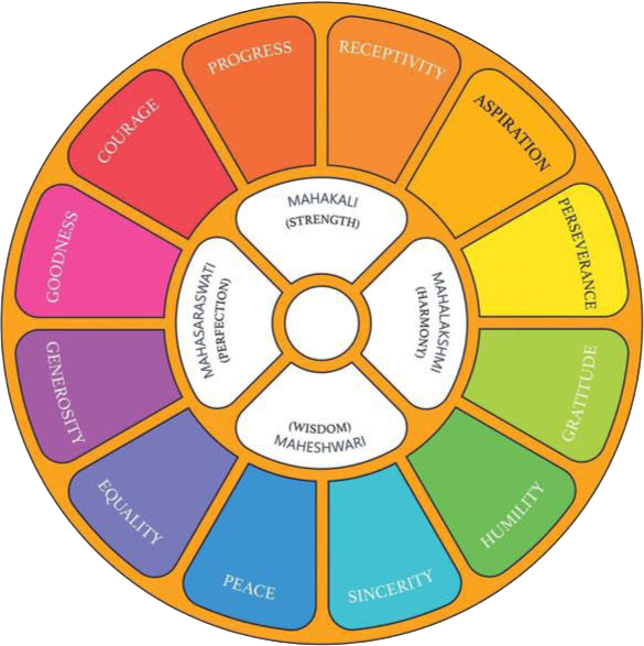 Este círculo simboliza doze qualidades espirituais que apoiam o crescimento interior e a transformação da consciência. Cada cor representa uma virtude que pode ser cultivada na vida diária através da prática do Yoga, da consciência e da devoção.